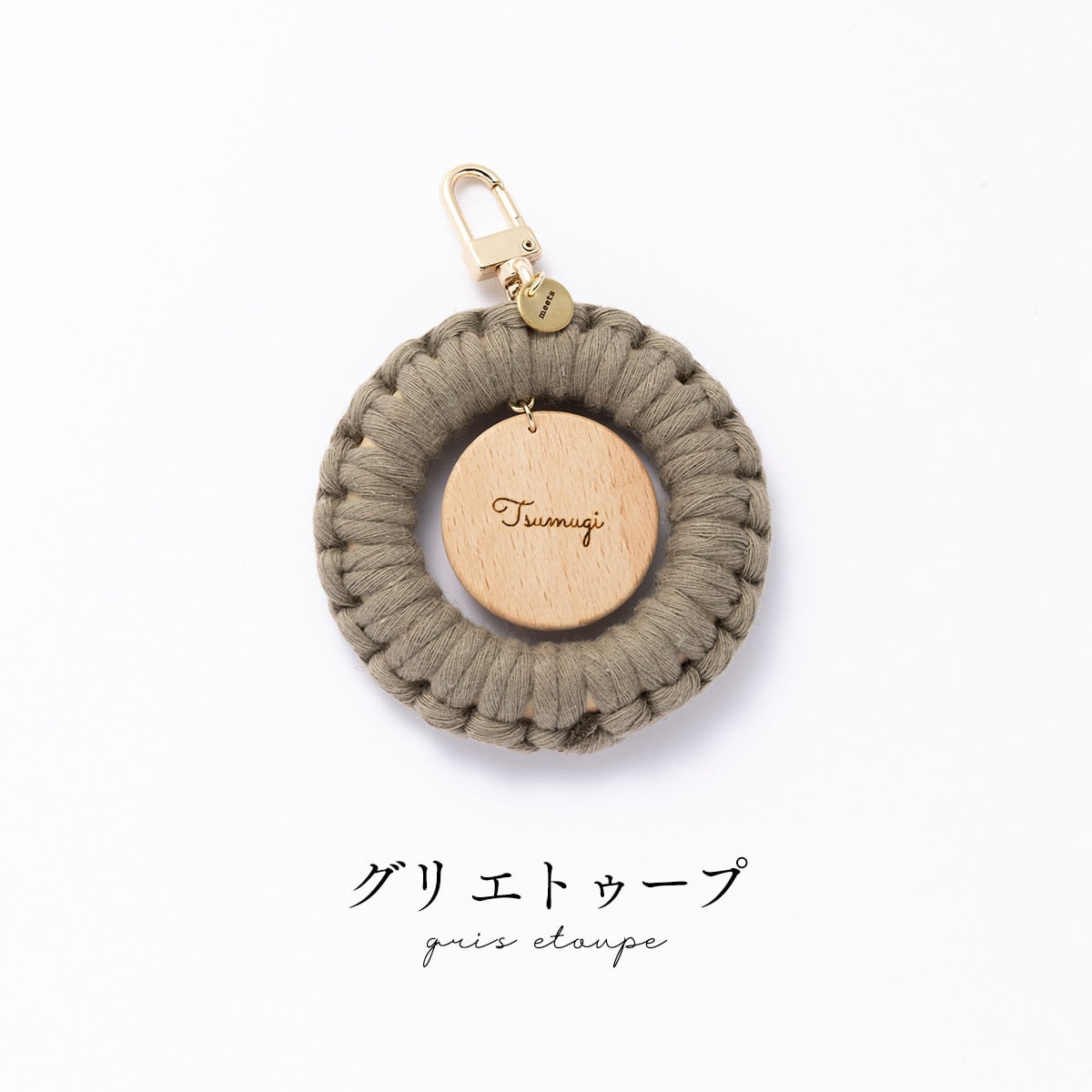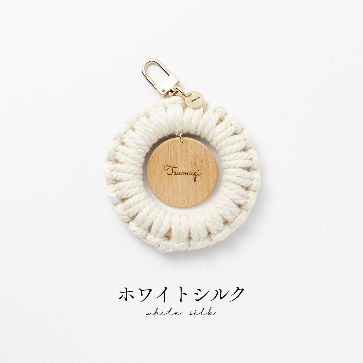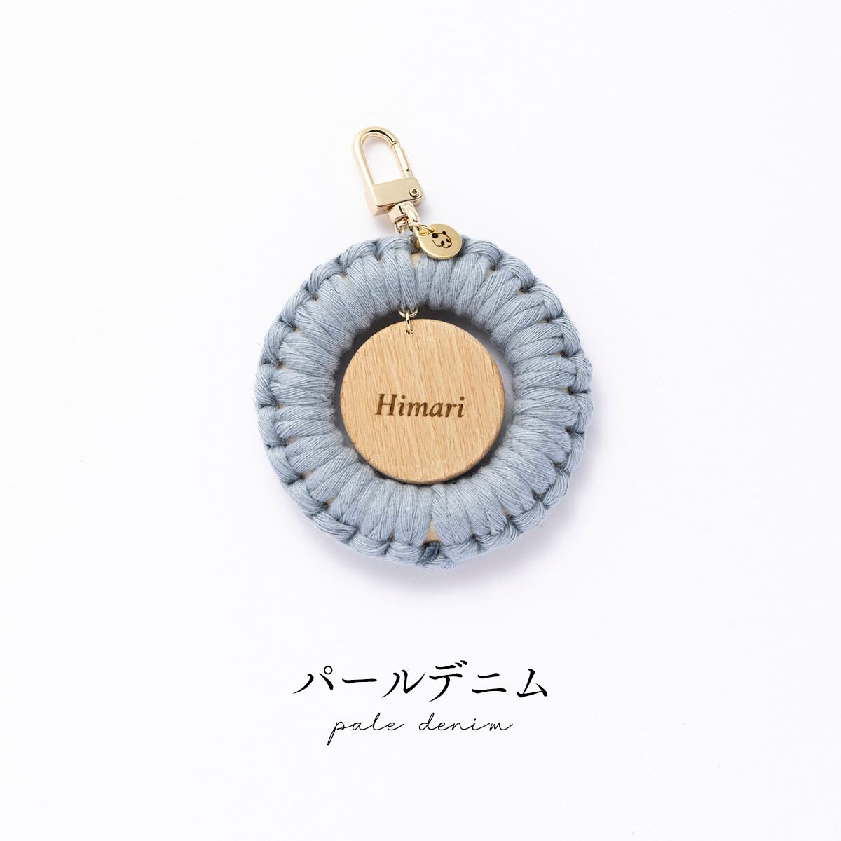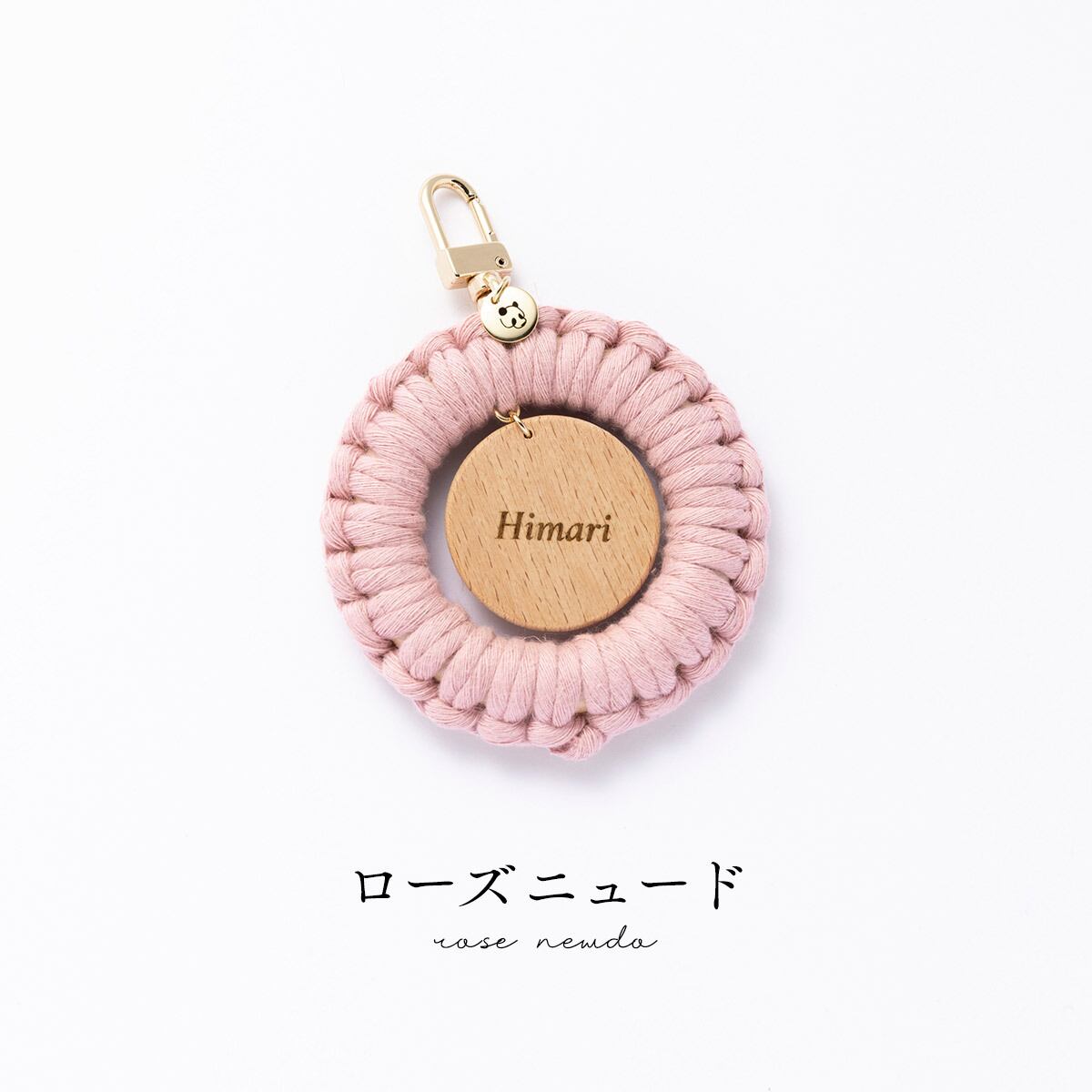 ナチュラルウッドの温もりを感じるネームホルダーに、ひとつひとつ丁寧に編んだマクラメリングを組み合わせました。中央のネームホルダーは歩くたびに揺れて存在をやさしくアピールしてくれます。