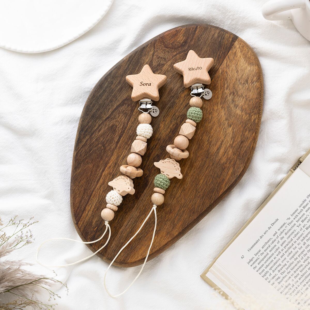 meetsオリジナルステゴサウルスのウッドビーズがポイントのマルチホルダー/おしゃぶりホルダー/トイホルダーです。meetsではレーザー彫刻での名入れも無料!(※星クリップ部分のみ)こちらの商品はスタイや抱っこ紐・ベビーカーなどに取り付けて、おしゃぶりやオモチャなどの落下を防ぐホルダーです。